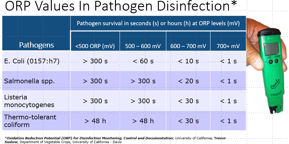 Recente studies hebben aangetoond dat het vermogen van een formulering om pathogenen te oxideren kan worden geïdentificeerd en gemeten met behulp van de Oxidatie Reduction Potential (ORP) van een oplossing *. ORP meet het vermogen van een oxidatiemiddel om pathogenen te doden door elektronen weg te nemen van een celmembraan, waardoor de integriteit van de cel wordt vernietigd, wat tot een snelle dood van het organisme leidt. De volgende tabel geeft een samenvatting van resultaten uit diverse laboratorium simulatie studies, gemeten oplossingen in millivolten (mV) gecontroleerd door dr. Trevor Suslow, Universiteit van Californië.