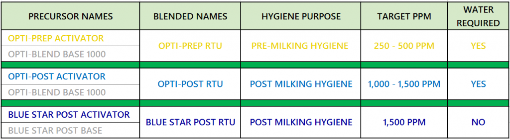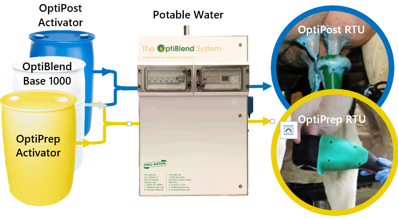 Het OptiBlend-systeem biedt een compleet assortiment hygiëneoplossingen op locatie met behulp van chloordioxide gebaseerde technologieën. Het OptiBlend-systeem heeft de mogelijkheid om specifieke formuleringen ter plekke nauwkeurig en consistent te monitoren en te produceren, waardoor het een ongeëvenaard betrouwbaar en economisch product is . Het OptiBlend-systeem controleert en produceert zelf twee of meer chloordioxide gebaseerde formuleringen, gemengd ter plaatse, met het gebruik van drinkwater. Dit vermindert de kosten van het produceren van hoge volume pre- en postmelkhygiëneproducten dramatisch door de tijd, verpakking, opslag en verzendkosten te verminderen, tegelijkertijd de sterkte en stabiliteit van de on-site producten te verhogen.